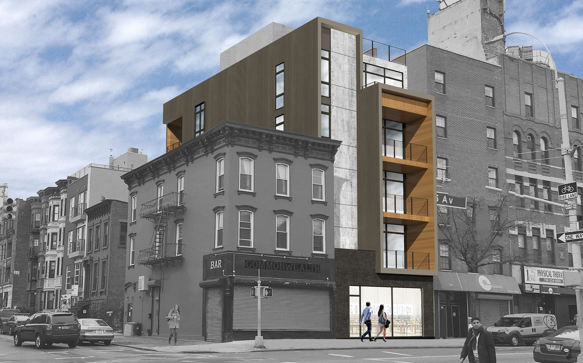 A new 9,000 sf sustainably designed, mixed used building boasts four luxury floor through apartments with ground floor commercial. The extruded metal skin reveals a core of wood, concrete and glass. [new construction]