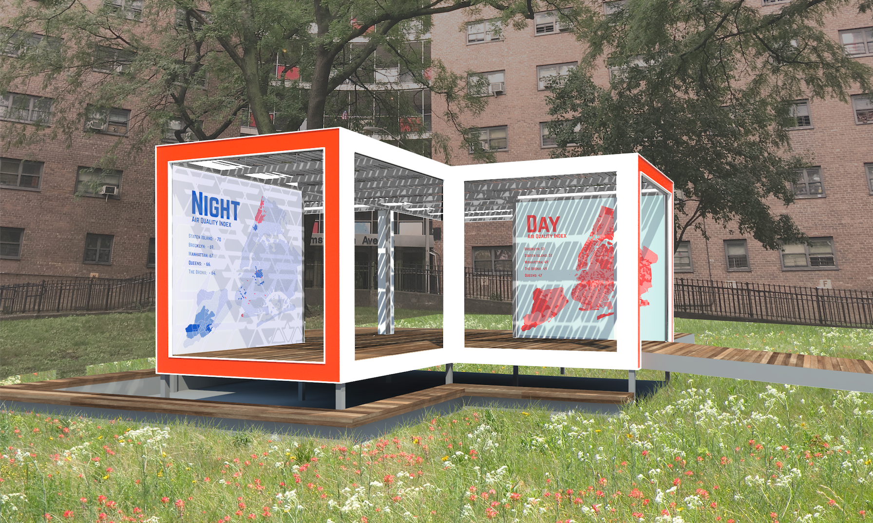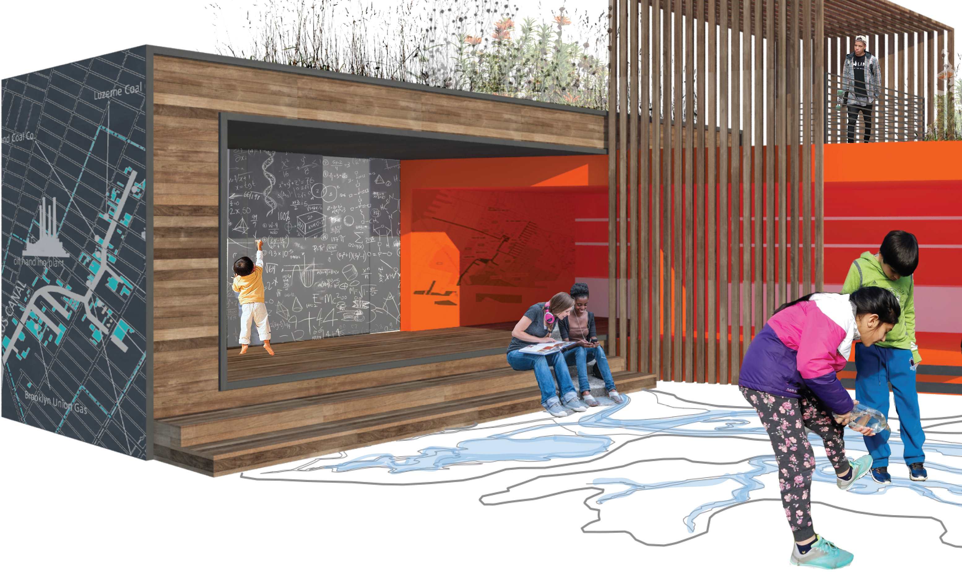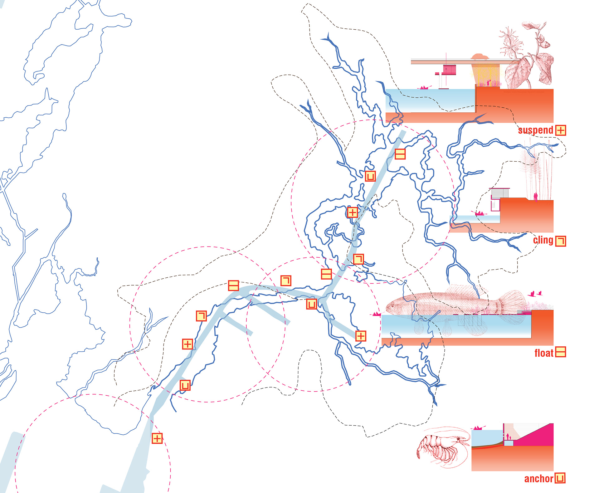 Gowanus Field Stations is an exploration of the ecology of the canal, through temporary public “seeds” dispersed along its length. Each field station creates a dedicated space for people to observe and engage with a distinct aspect of the canal: 4 typologies [suspend, cling, anchor, and float] create a shifting, composite understanding of the area, and recognize the intermingling of human and natural systems. Major goals include : localizing, understanding and decoding research; an interactive relationship to the science of the canal’s ecology; creating space for direct observation; public space that retains backstage quality; not a radical rewriting of the space, rather smaller insertions within it.