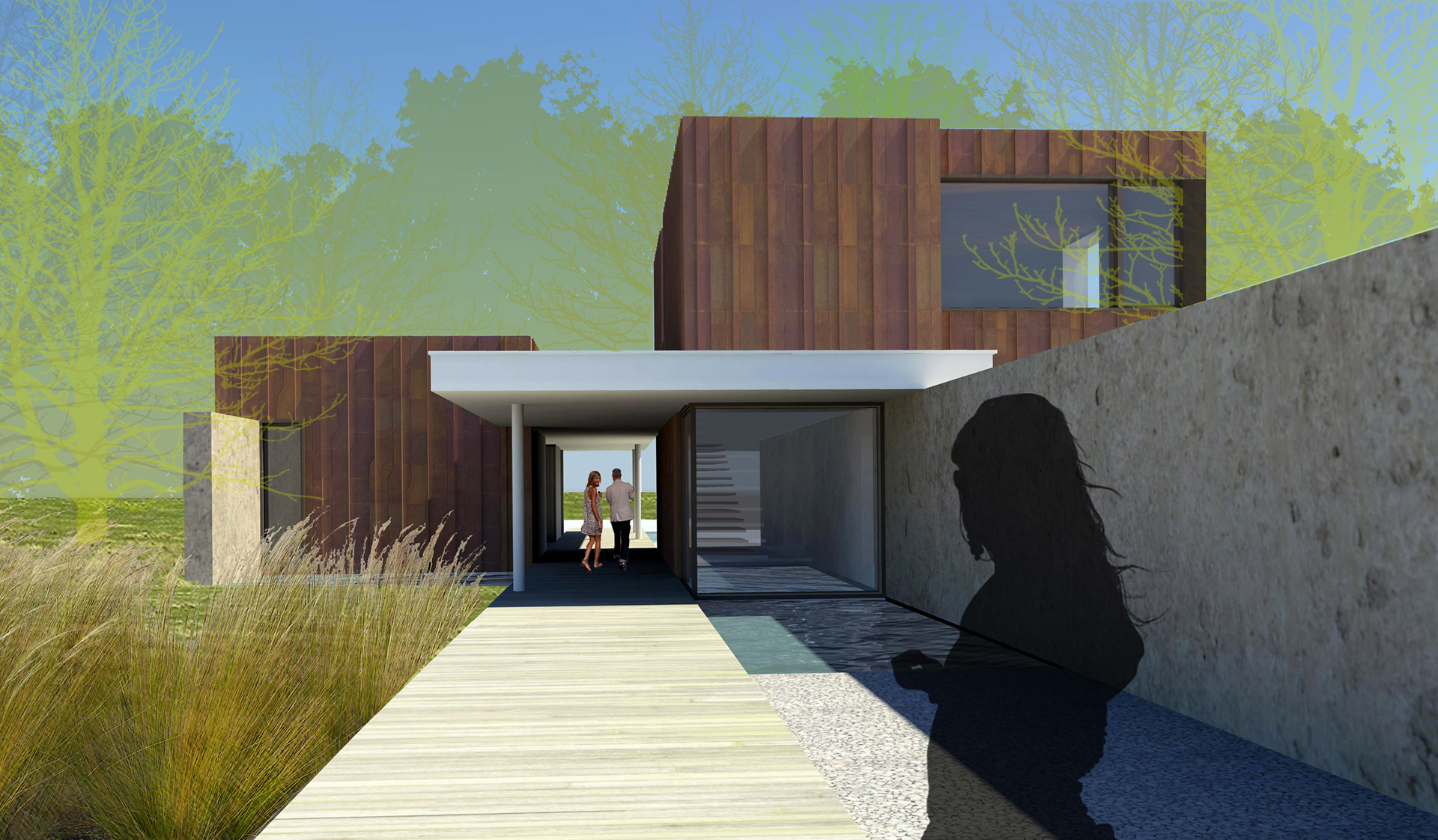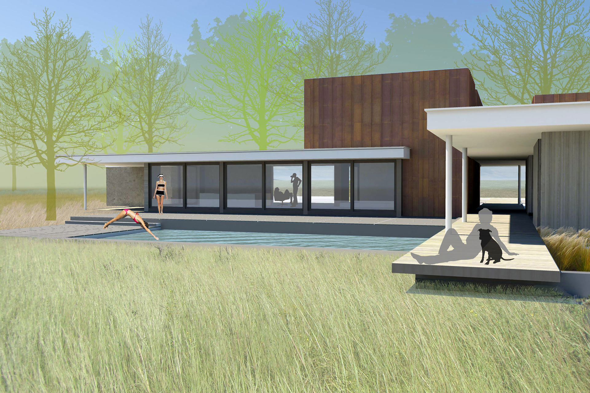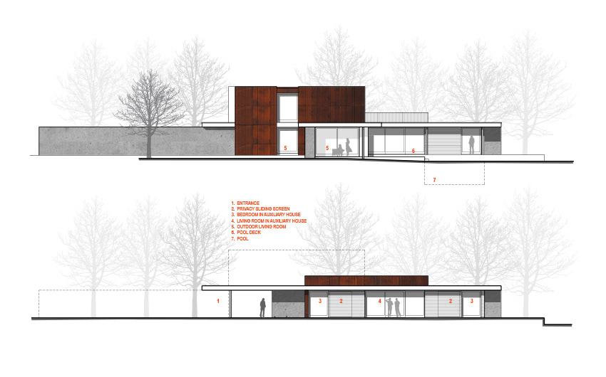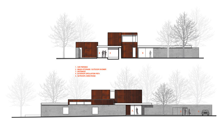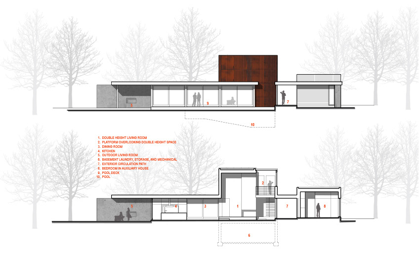 Arranged along a single elegant line, the pier house is comprised of two linked buildings and a sequence of outdoor spaces and pools. A 2,000 sf main house and a 950 sf guest house slip past each other on either side of the path, opening onto and defining the main courtyard. It achieves net zero status as a result of a highly insulated envelope, efficient fixtures and mechanical systems working in tandem with a geothermal system and photovoltaic array.