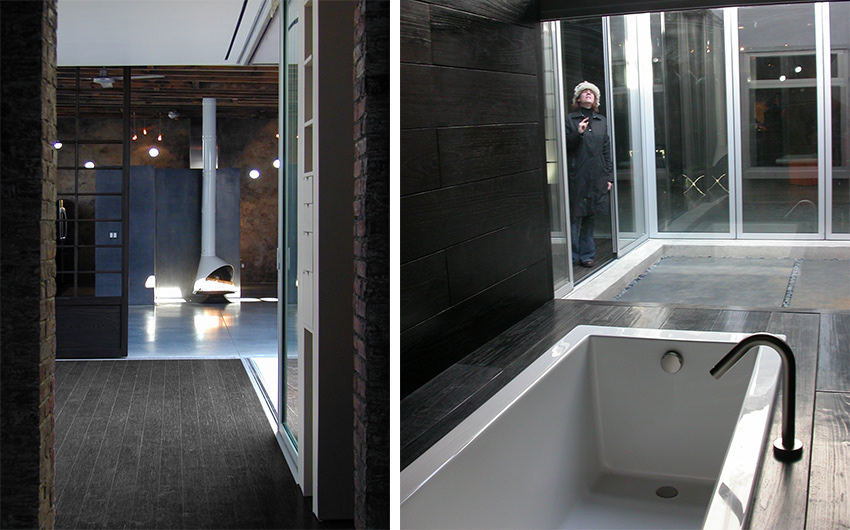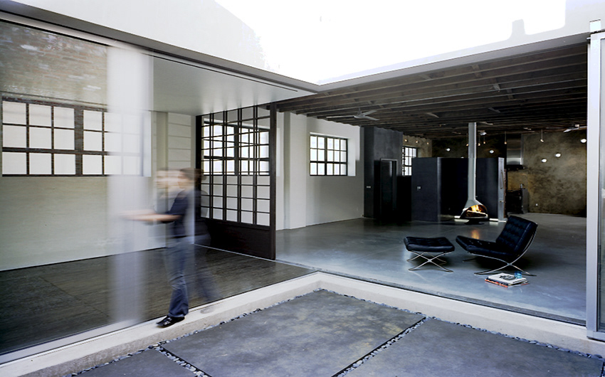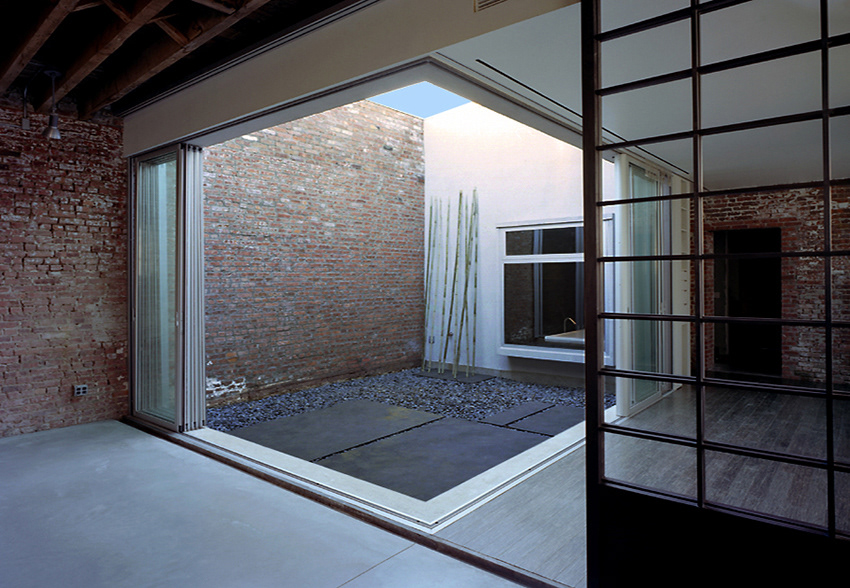 Formerly a printing house, the conversion of 5,000 sf one story manufacturing building into a residence, artist studio, and event space is organized around a new small courtyard. The large sliding doors dissolve the line between inside and outside. Some green strategies include (1) the choice of materials with low environmental impact, (2) energy efficiency of appliances, mechanical systems, and passive design systems, including a solar PV array (3) enhanced day-lighting, and (4) design for flexibility, durability, and low maintenance. in collaboration with julie torres moskovitz. photos by andreas kornfield [renovation]