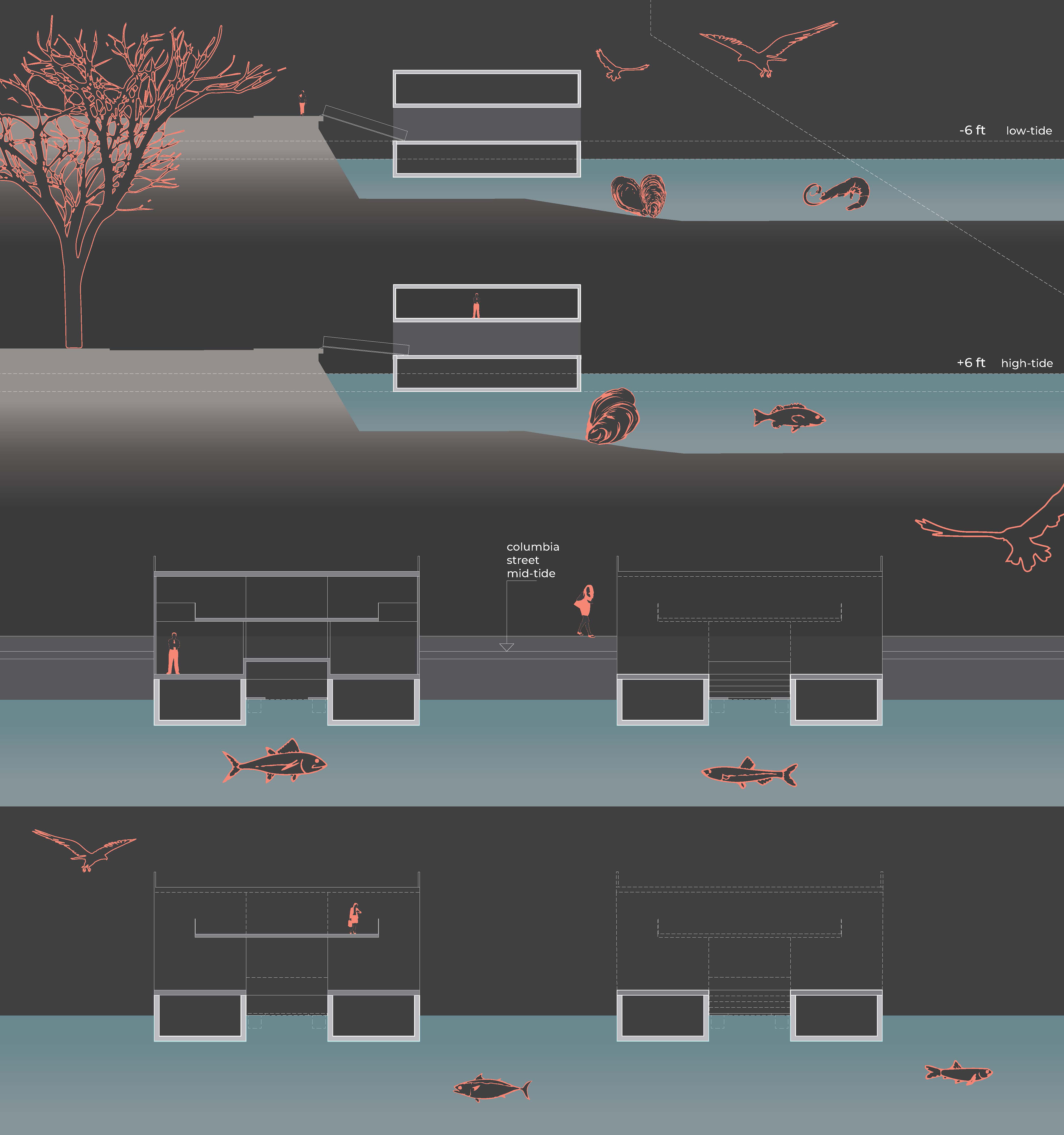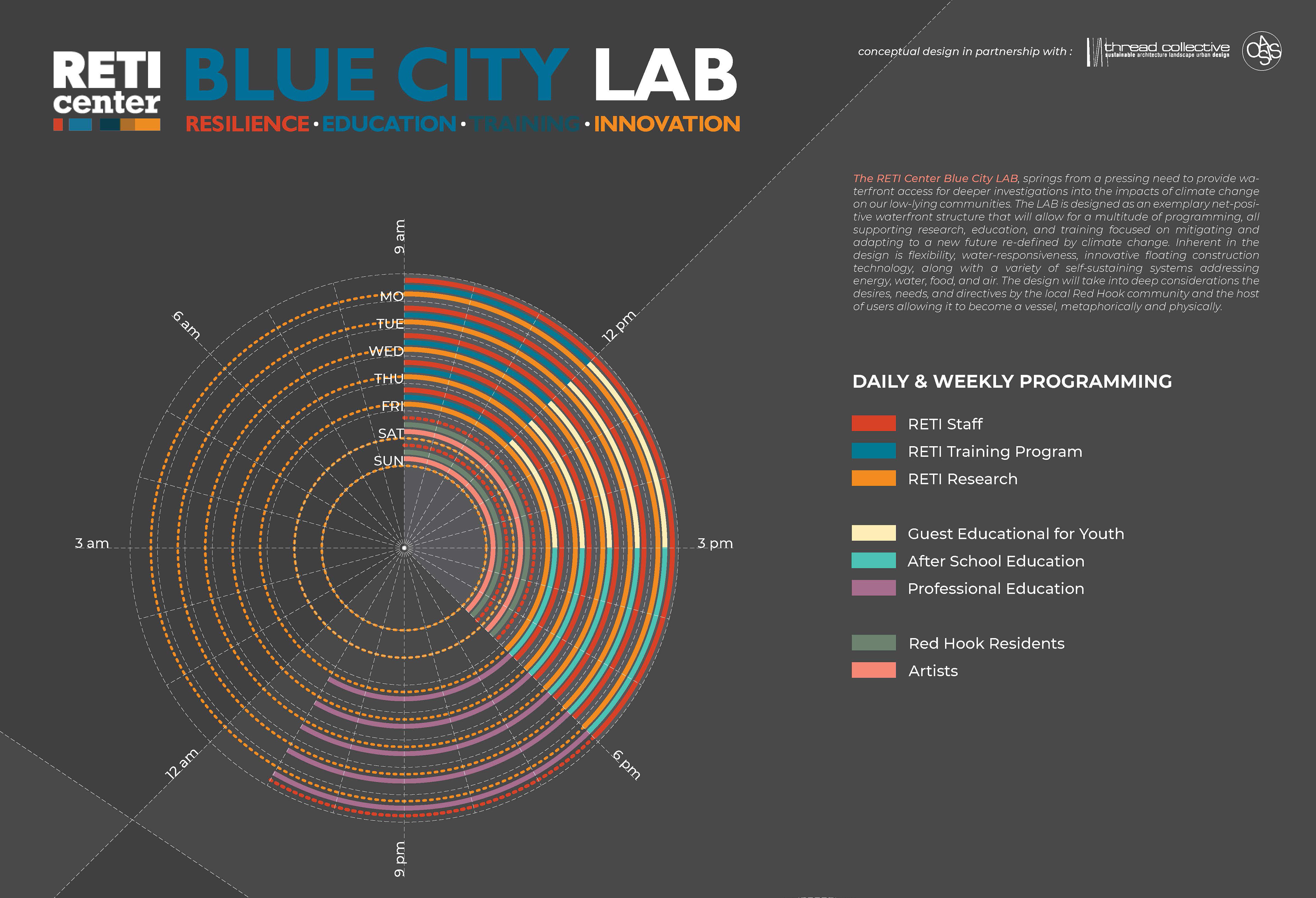 Resilience Education Training and Innovation Center The Blue City Floating Lab is an outgrowth to RETI's exploration to find an appropriate home that emphasizes its mission, to create technology and economic growth through climate change adaptation for New York. The Blue City Floating Lab will create a resilient, off-grid, floating climate lab in the US, the first of its kind, to serve as a model for adaptation and resilient industrial development in flood zones. A parallel larger visioning project digs deeper into how to become a model for equitable and resilient waterfront development nation-wide. Through collaborative, multidisciplinary study into climate solutions, green workforce development, and local coalition-building in Red Hook, the lab will serve as both a social hub and research center. Additional partner firms: One Architecture & Urbanism (ONE) and Space & Matter, GBX. Site Feasibility Study, REDC Grant + Blue Cities Floating Lab Concept Design in partnership with Oasis Design Lab