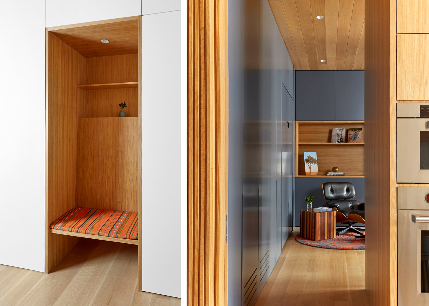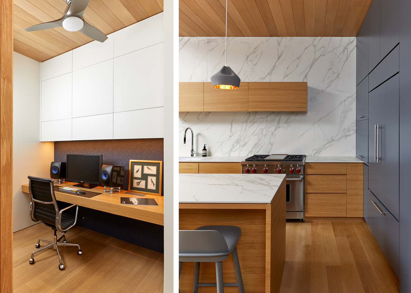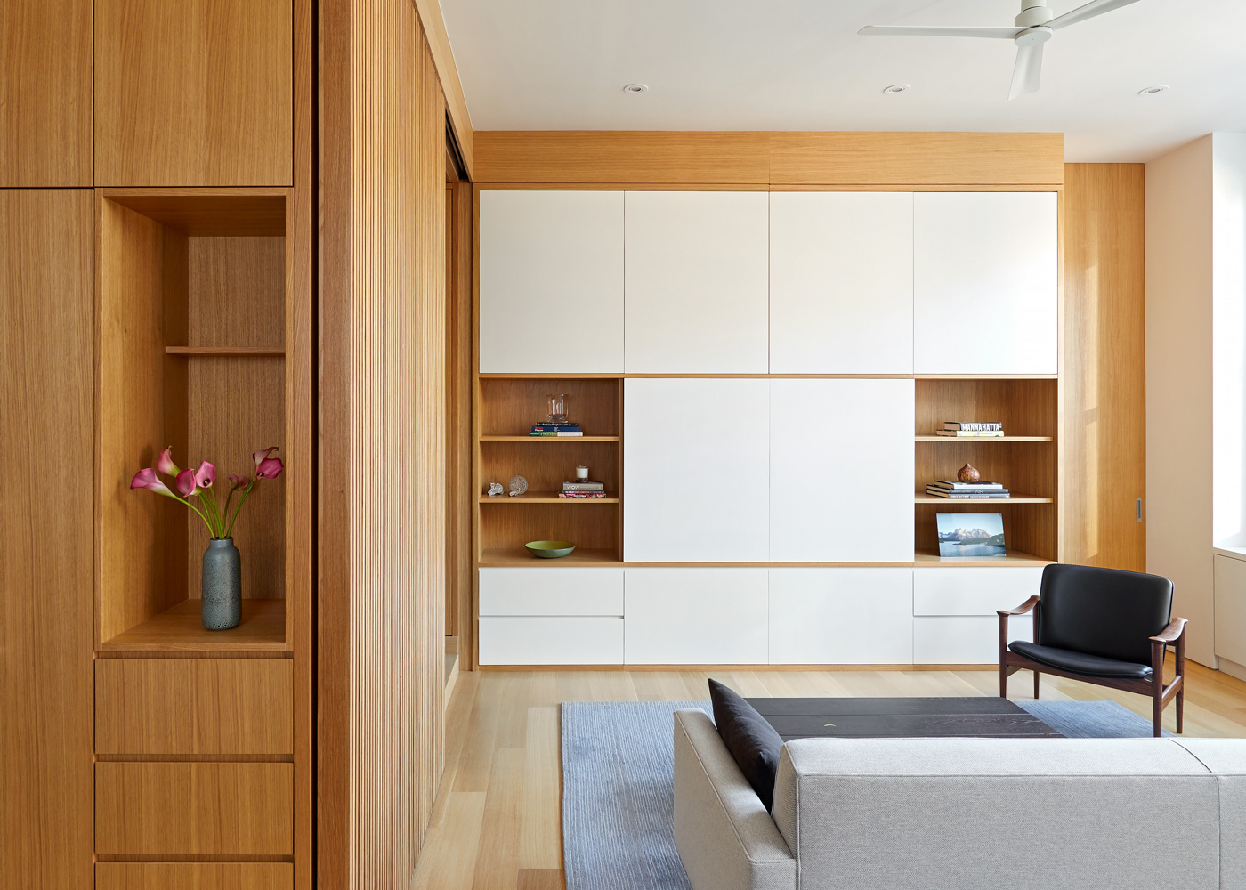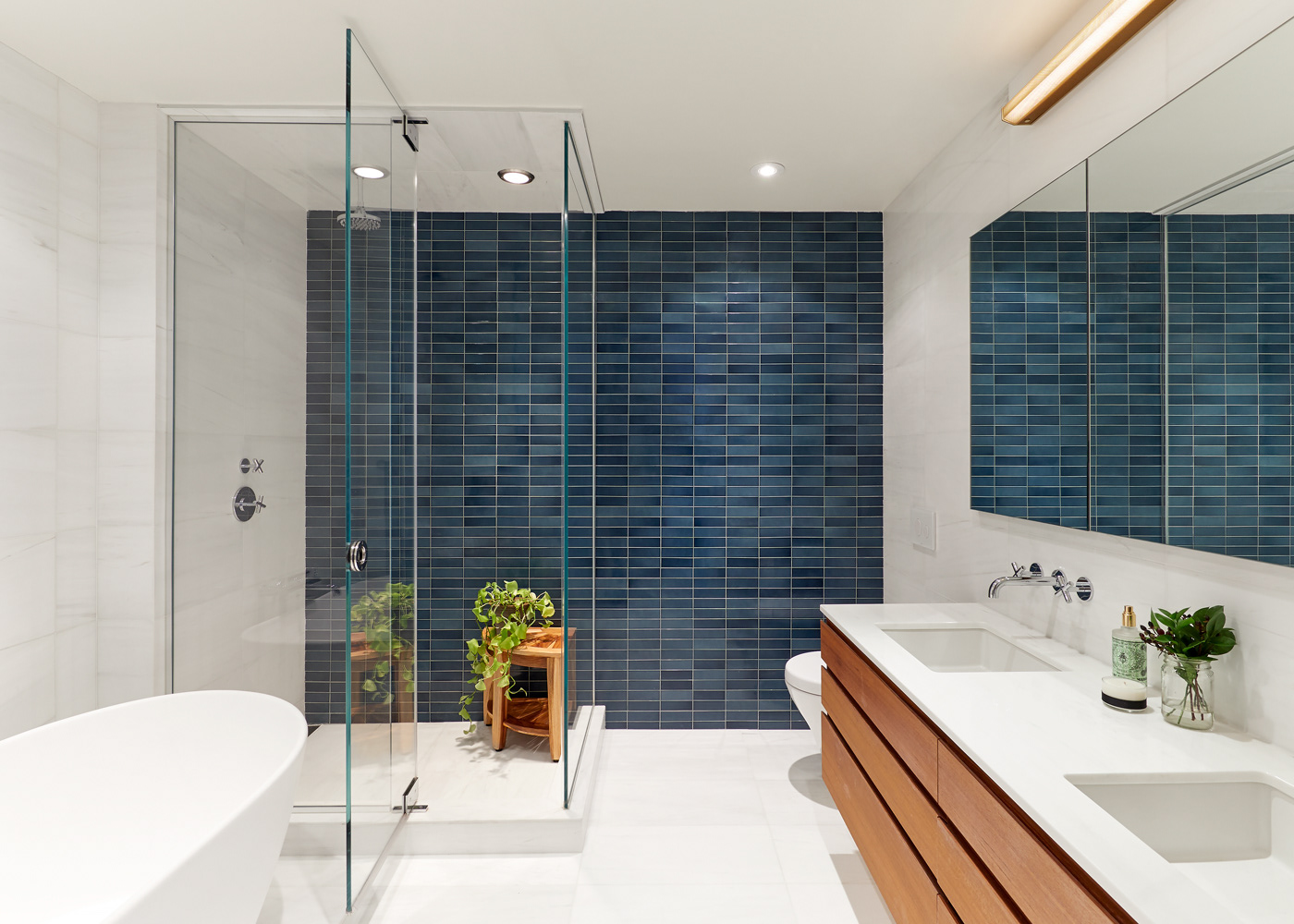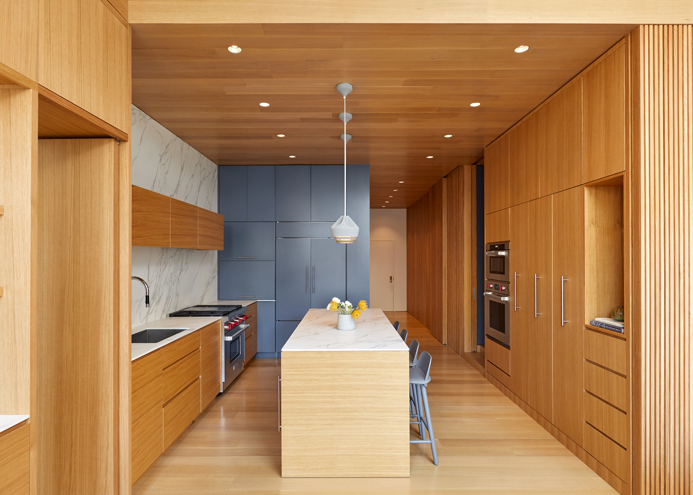 A 2,000 sf full renovation created a seamless integration of two conjoining apartment, allowing for an expansive 50-foot line of east facing windows. Simplicity and detail were key, keeping the finishes to a simple palate of white oak and deep rich blue while playing with texture, grain, and accents. A set of full height sliding ribbed doors creates an interior space that can open, acting as a connector, or close providing privacy for guests.
